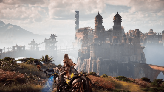 The world is also a beautiful one, set in a “post-postapocalispe”, in the new civilisation that has emerged after the fall of society as we might know it in the near future. The world is a smattering of snowcapped mountains and frosty forests, mixed with hollowed out skyscrapers and twisted metal skeletons of a once bustling metropolis. All around the world being stalked by large advanced machine animals, all serving some strange unknown purpose. It’s gorgeous to look at and the mix of beautiful scenery with the expose musculature of the synthetic animals works in this really cool way.