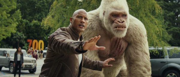 Very loosely based on the video game by the same name. Rampage follows primatologist, ex-marine, huge dude and most charismatic person who claims to hate other people Dwayne Johnson who works closely with the apes in a San Diago wildlife preserve, namely an albino gorilla called George of almost human intelligence. During a blundered science experiment, the subject of a highly dangerous growth hormone breaks loose on a space station and destroys everything in an opening scene that feels like it was ripped from another, very different movie.