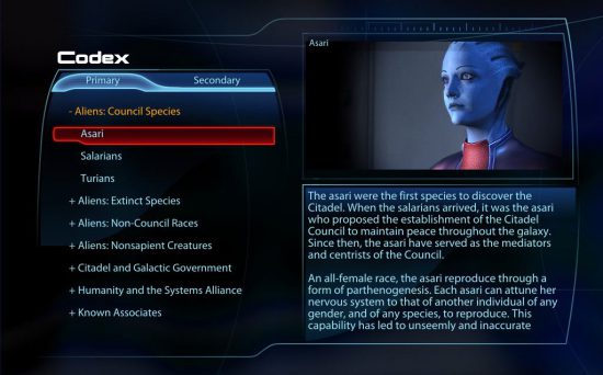 This is why the game’s Codex was such an obsession for me. Like the dialogue with non essential NPCs, as the player interacts with the world, entires are constantly popped into their codex. A huge log of information about the races that occupy the galaxy, parts about their biology, their history, their spirituality and their place in the current galaxy.