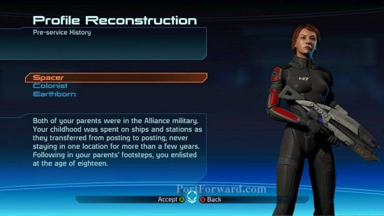The game’s initial customisation options are very interesting. Aside from the basic choices of Gender, appearance and class, the first Mass Effect allowed the player to define their character’s upbringing, as well as the defining event of their military career. Throughout this first game, character will reference your origins or your past on a number of occasions. It was something that I always found fascinating about the game.