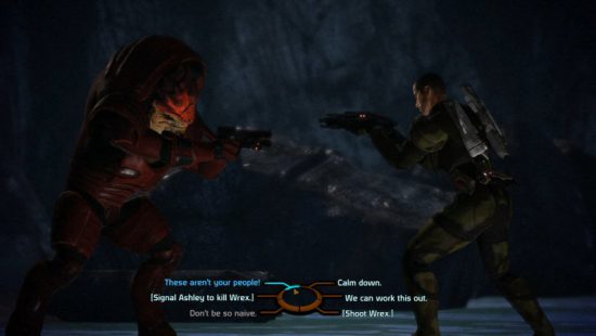 Aside from the fact that you can downright abuse (or kill) your own teammates during dialogue, Shepard can be openly xenophobic to any non human they meet, expressing distrust to pretty much every alien. In fact there is a higher level of xenophobia and anti alien sentiment throughout the entire game from all races. This seems to be phased out greatly in the later games. Which is a shame, because it works in favour of the game’s world building to shy away from the utopian society it might seem like in fist glance.