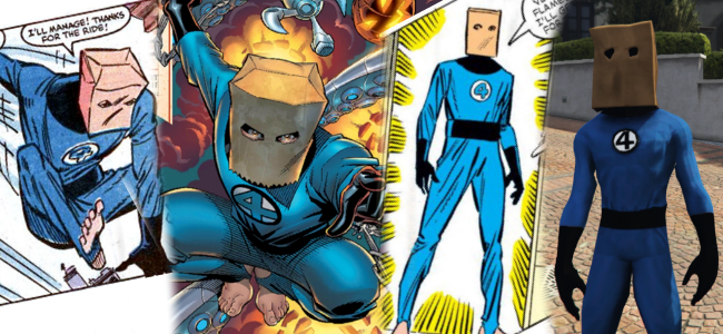 Ever helpful, The Human Torch provided him with a spare Fantastic Four uniform as well as a paper bag to cover his shame/face. For good measure, he pinned a “kick me” sign to his back as he left.
