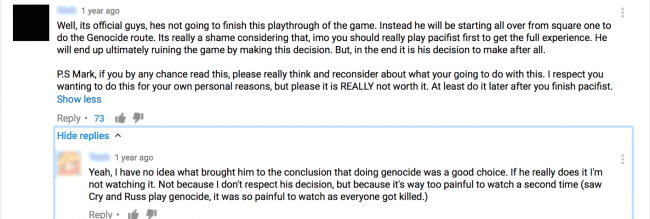 It’s ironic that Toby Fox’s meta commentary on choice in video games quickly became an excuse for people to be crappy to one another, over their desire to force their own experience onto other people rather than let them have that feeling organically. The sense of discovery surrounding the game was lost when Youtubers and social media was packed to the brim with spoilers and things concerning the ending. So much so that many Youtubers decided to avoid playing the game all together simply to avoid the fandom.