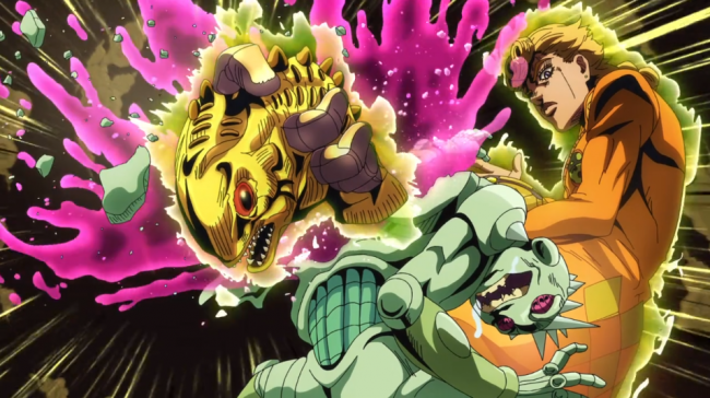 The following is a pretty cool action sequence, in which Giorno has pieces of his body plucked out of his body in the form of meaty cubes. As he’s left on the ground, seemingly lost against this “invincible” stand, we don’t cut away with a “to be continued”, instead we get a surprisingly quick turn around. Girono goes from being on death’s door and turns the tables on the enemy stand. He realises his own abilities mirror that of the enemy, and is given new insight into how to use his own powers, countering the enemy perfectly.