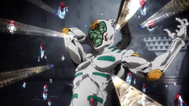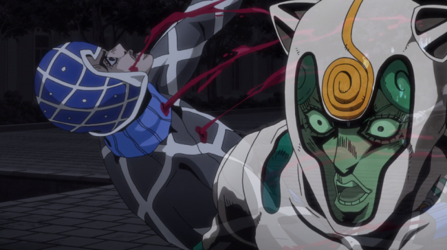 Mista begins to lose hope, as he gets shot up, only to be broken out of his stupor thanks to a rousing speech from Giorno that culminated in him smashing his own arm up for effect. Gaining a second wind, Mista enacts his plan of shooting the enemy a whole lot, consequently getting himself shot up a whole lot more. But ha! that was all part of his master plan, as the excessive bloody splash back freezes on Ghiaccio’s visor, giving Mista the opportunity to kick him into a spike on a nearby lamp post.