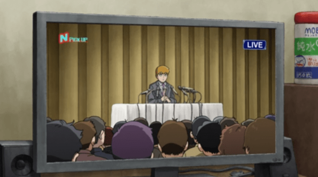 Mob, who apparently was watching in some form, causes a huge telekinetic distraction in the room at this. One which allows Reigen to simply walk out, leaving the public’s perception of him ambiguous as to whether he was causing this phenomena or not.