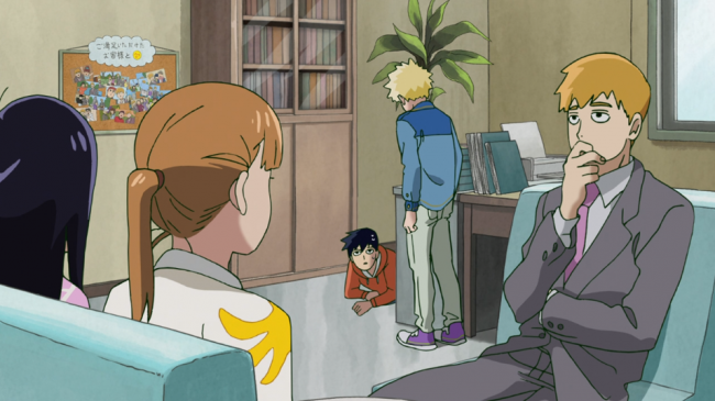 In the meantime, the girl he has been crushing on shows up at Reigen’s place, totally by chance. While there, she apparently realises that Mob had been working for Reigen and then asks him some probing questions. It just so happens that Ritsu is there and misunderstands the situation, thinking that the Takane has a boyfriend already. It creates a little conundrum for him as he ponders whether he should tell Mob or not.