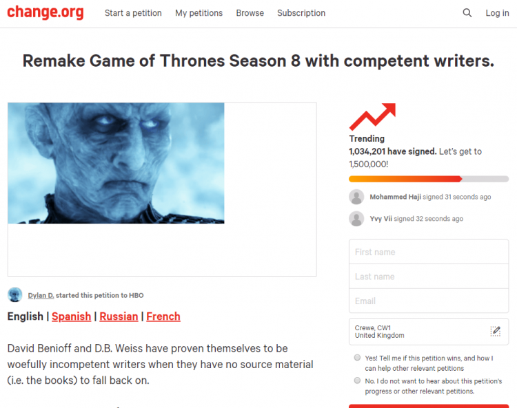 There’s been a petition on Change.Org been doing the rounds on social media this past week. One that has been getting a lot of attention, for better for for worse. Mostly worse. With over 1 million supporters as of the time of writing this, “Remake Game of Thrones Season 8 with competent writers” is a sad commentary on the current state of fandoms.