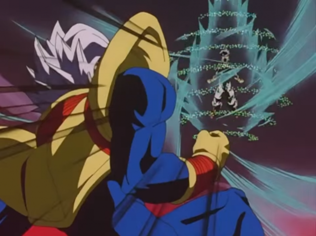 To me, it feels like the writers of GT kind of resent Uub. Like they knew they had to something with him, but it was through gritted teeth. When Uub finally shows up again, it’s to save Pan and face off against Baby. Now, despite lines from Baby saying Uub is more powerful than “the other Saiyans combined”, he ultimately loses against the Tuffle pretty easily.