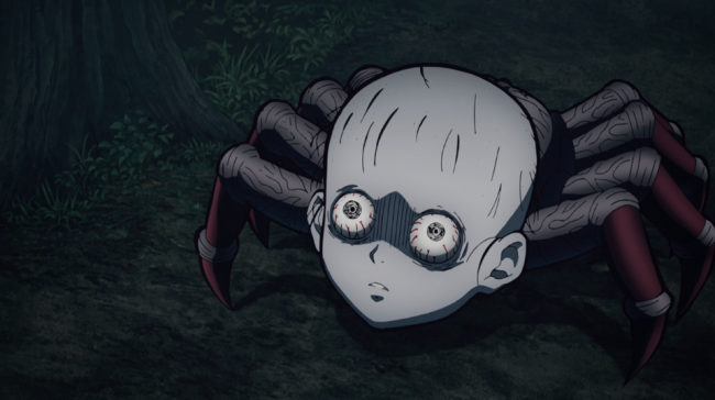 Although that crumbles away when he encounters a swarm of dead-eyed, doll headed spider monsters. And being totally honest, I am fully on his side this time. I am not especially fearful of spiders or anything, but the visuals of the demon and his mutated spider army are disgustingly horrifying in this episode. It makes me realise how well executed the horror elements of this show really are.