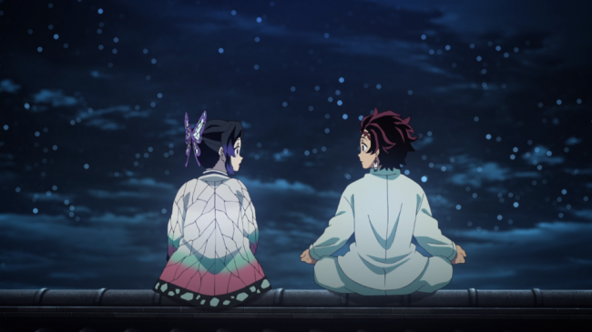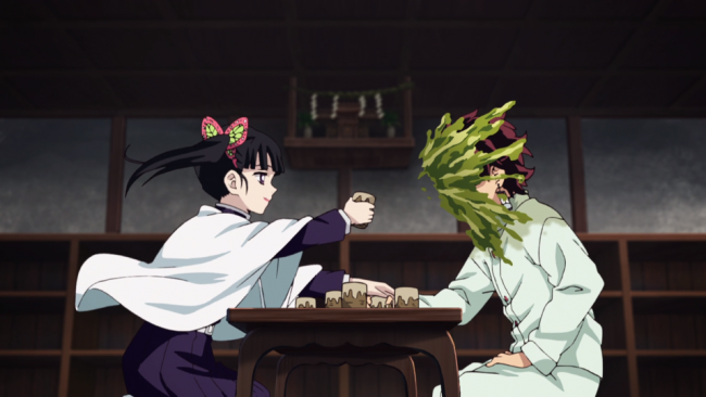 The best scene is the one between him and Shinobu on the roof. I always thought there was something kind of creepy about the insect pillar, but after their first real one-to-one conversation, Tanjrio is able to smell right through her. It turns out, her weird false smile is exactly that; a mask to cover how angry she always is.