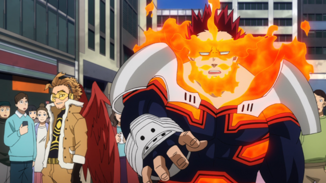 Shown later on when him and Hawks are taking a stroll around the latter’s territory and a young fan gets upset at Endeavor for trying to actually be approachable. It’s funny, the kid is such a hardcore fan that he knows unapproacahability is one of the hellfire hero’s major traits and wigs out when Endeavor tries to reach out to him. It’s fun.