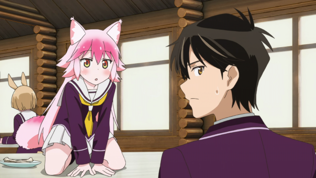 Jin Mazama is one of two human students in a school full of anthropomorphic animals, all of which seem to have a unique kind of sexual dimorphism in which all the male animals look like creatures they’re supposed to be, stood upright and crammed into a purple uniform, while the girls all look like regular anime waifus, just with some ears and possibly a tail.