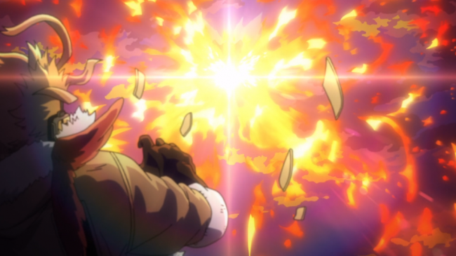 It becomes pretty apparent that this fight is a direct parallel to All Might’s final battle against All For One. And if you didn’t catch it on your own, the show “helpfully” states that outright rather than let the visuals speak for themselves, thanks anime. Only this time, it seems like the hero is going to fail. It’s only when the fanboy from the previous episode yells at everyone for giving up on Endeavor to qucikly, and points out that the Hellflame Hero is far from out of the fight.