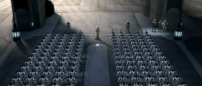 Right away we get a glimpse into how these clones are trained up and the imperfections of the process. Jedi Master and member of the Council; Shaak Ti oversees the training of the cadets along with two bounty hunters who act as drill sergeants.