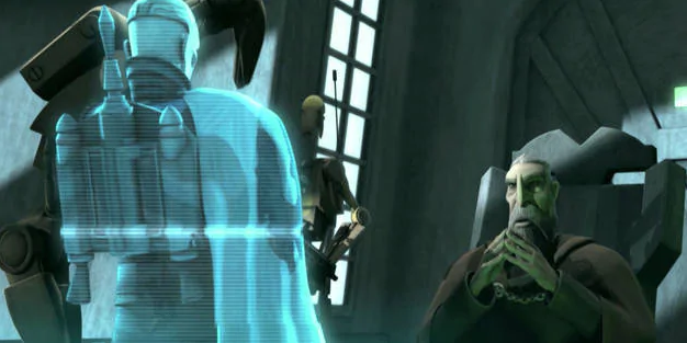 It’s almost like some puppet master, playing both sides of the war at the same time is doing everything in their power to get the Mandalorians to join the Separatists in this war. Between doctored footage of one of her representatives and continued assassination attempts upon her, Satine becomes increasingly paranoid, unable to trust anyone around her.