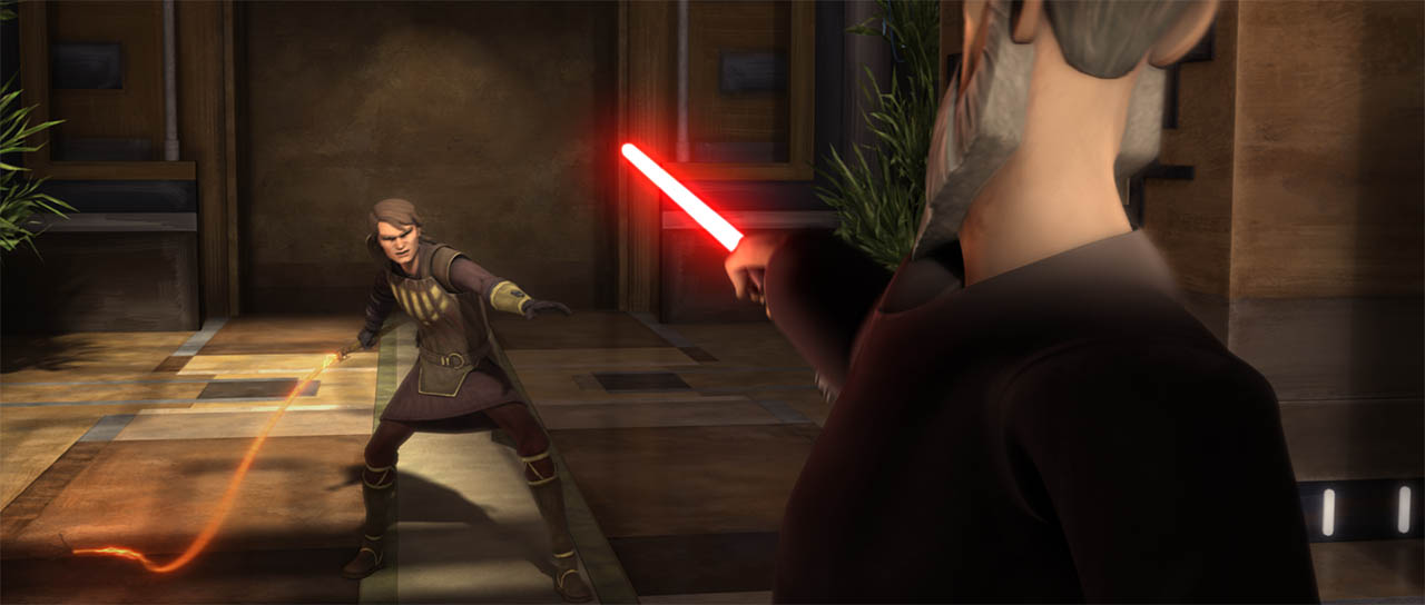 Obi-Wan Kenobi is summoned to the central spire in the city to meet with the Separatist leader stewing there, so they can talk about surrender. This leader is revealed to be a Zygerrian; an almost catlike alien created for the purposes of this series. Upon seeing the alien, Anakin shows an especially venomous outburst of anger. Zygerria is a world that once ruled an entire Empire on the backs of a massive slave industry they created.
