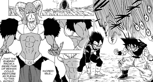 With many of his unique traits squashed down out of sight, he becomes much of a focus in the story. With the big question being whether our heroes can do anything to counter him and his magic, initially based around whether Goku can re-attain Ultra Instinct again or not. Something he ultimately fails to do. It’s during this part of this story that Vegeta returns to save Goku in a very welcome reversal of the standard formula. Using his new Forced Spirit Fission technique, Vegeta uses Moro’s own powers in reverse and sends them back to where they came.