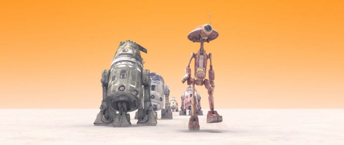 Like with the episodes at the end of the previous season, where the title card was coloured red to build hype for the return of Darth Maul, the title for these next four episodes are painted a light blue colour. In commemoration for everyone’s favourite astromech droid R2-D2. As he’s the only recognisable character present throughout most of these episodes.