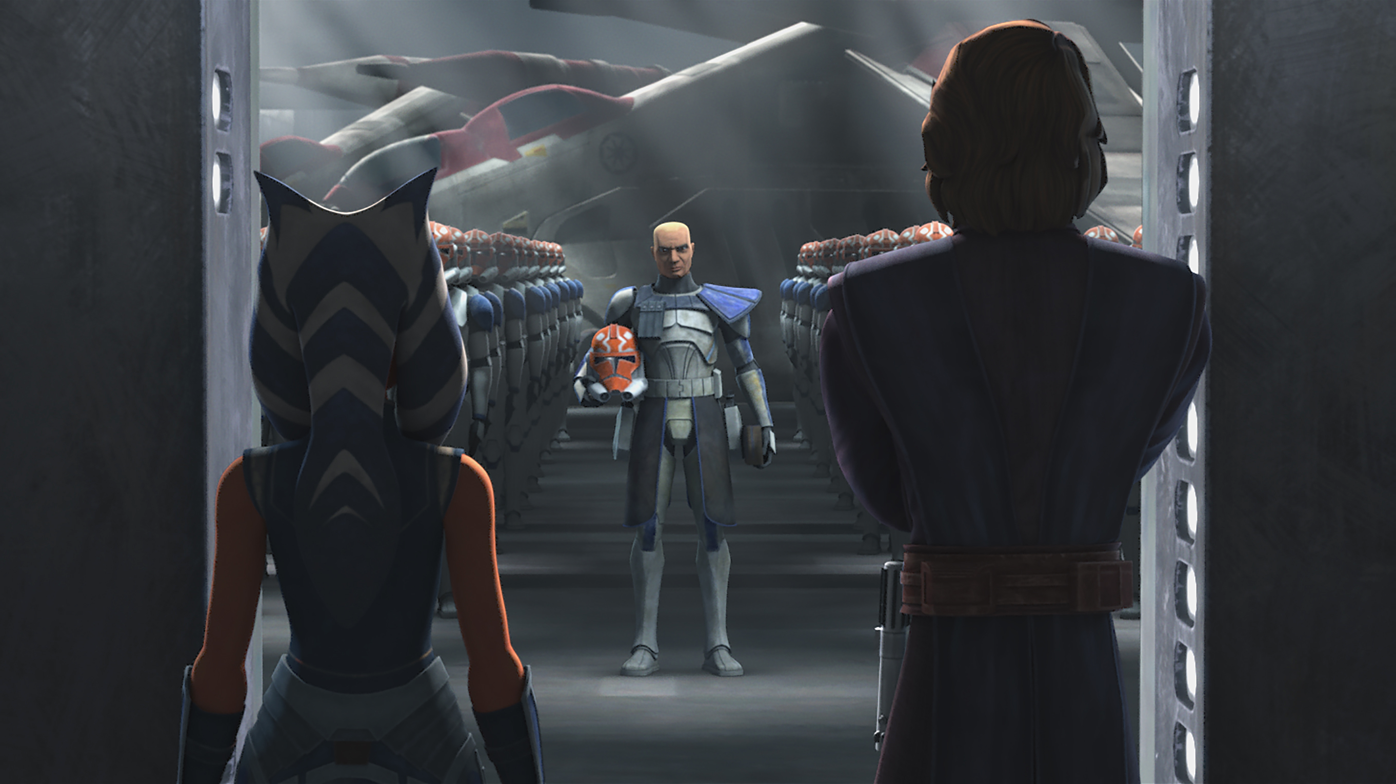Rather than escape right away, Rex and Ahsoka return to the crash site to honour their fallen comrades. Burying all of the Clones they can find and making a monument to them. There is no spoken dialogue, only Ahsoka standing before the helmets of her former comrades and friends, their helmets still painted with a pattern to match her own facial markings.