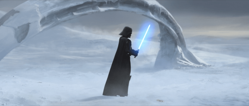 We cut to some years later. In a time where Imperial Stormtroopers are investigating the crash site along with the black clad Darth Vader. Vader, amongst the dust and snow finds the lightsaber of his former apprentice, no doubt recognising it thanks to the work he did on them while her held onto them for her for those months.