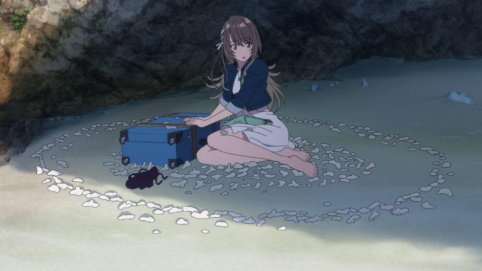 The first things we learn about her is that she is giving up on her dream and returning home. It’s not really super clear to begin with whether she’s being forced out by the industry or she’s giving up on her own. But when she’s on the phone to her mom, who doesn’t seem too broken up about her daughter’s dream being in tatters, Fuuka makes the snap decision to board a plane to Okinawa instead.