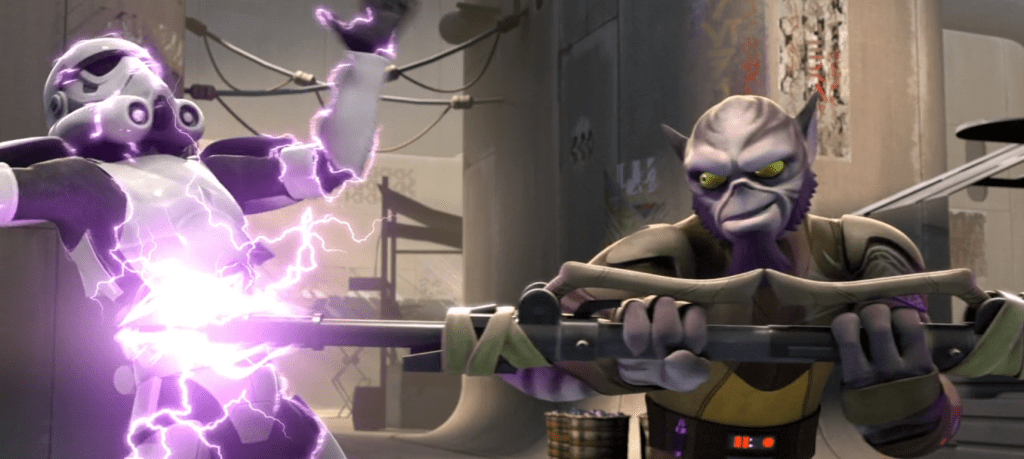 Zeb is a big guy with a heart of gold, filling that same mould that Wrecker would go onto embody during the Bad Batch. He get’s lost on his way to a rendezvous with Kanan and ends up saving an Ugnaught merchant from some harassing stormtroopers. Only in doing so he finds himself ambushed by the rest of their platoon.