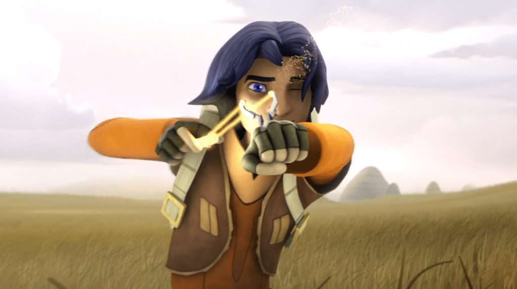 It’s only thanks to the timely intervention of Luke’s Theme from the original Star Wars score, we realise that Ezra is force sensitive and able to dodge the cannons at the last moment. Without missing a beat, he uses a little electric slingshot to disable the pilot and mock him one last time before marching off to sell his ill gotten gains on the black market.