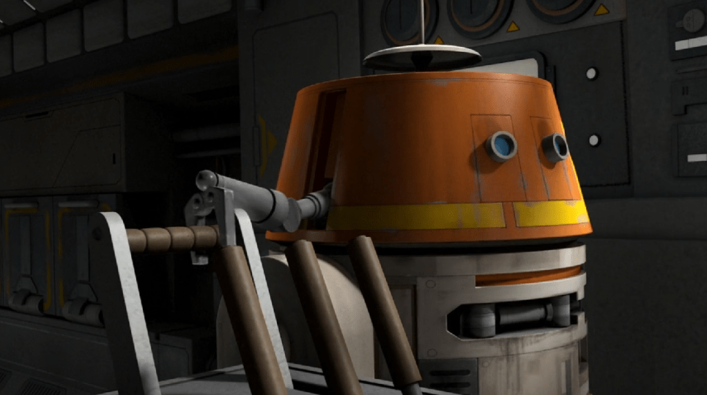 Who is your standard R2-D2 type. Although he seems much more easily frustrated by his crewmate’s bickering than R2 ever was. Showing visible annoyance with them resulting in taking matters into his own “hands” by the end.