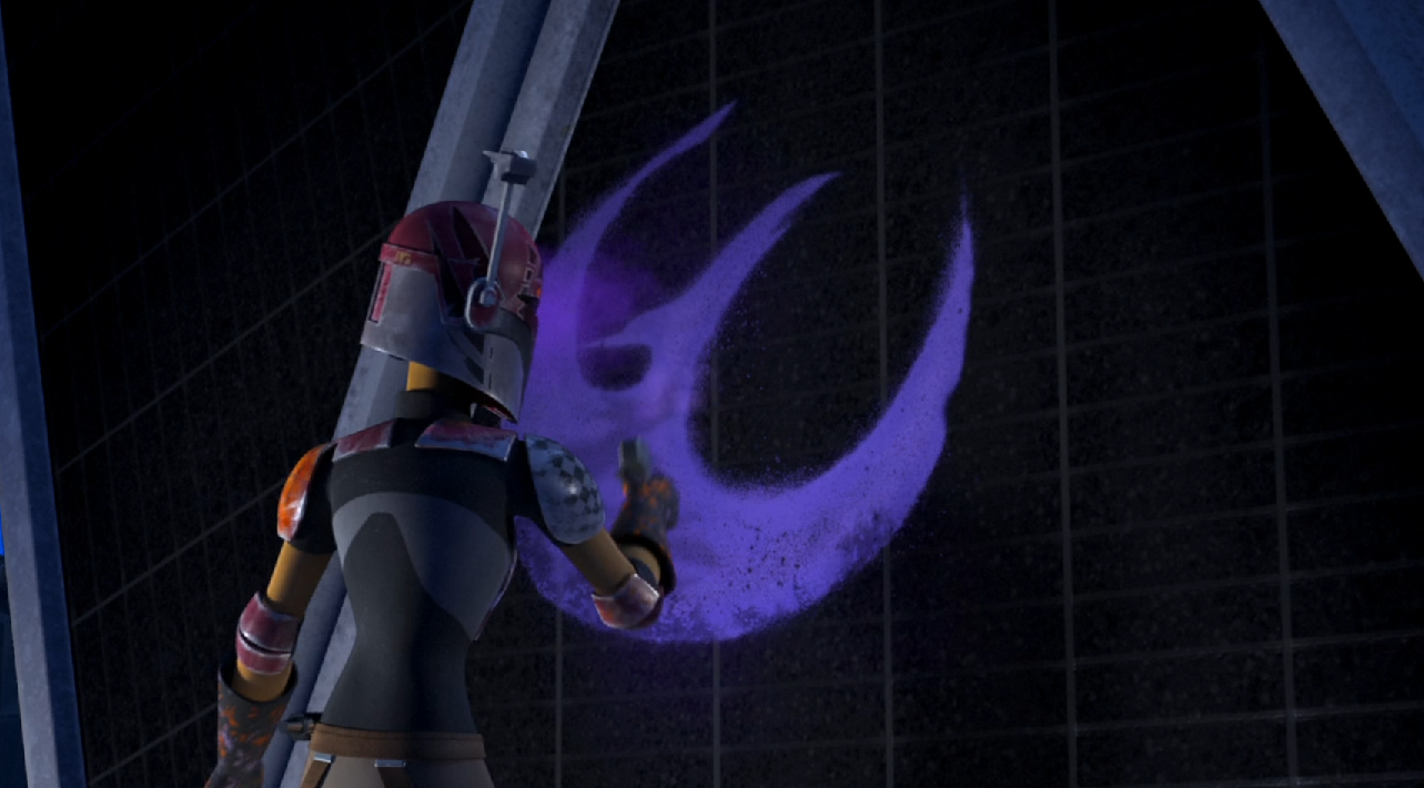 Anyway, this short is introducing us to Sabine Wren, a woman who appears to be Mandalorian causing a distraction for the Ghost at an Imperial landing platform. She spray paints a Rebel Starbird insignia on the wing of a TIE while a collection of bumbling Stormtroopers fail to capture her. Culminating in her exploding a non-lethal paint bomb in their faces to allow a ship to escape.