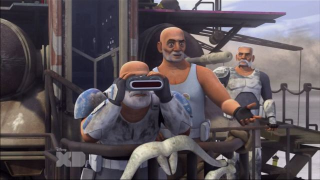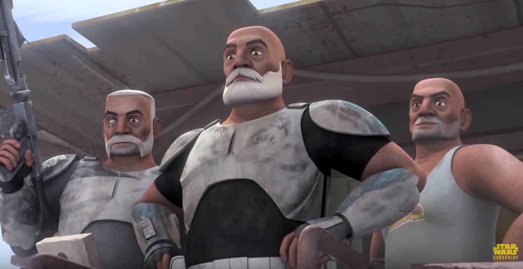 It leads them to the desert world of Seelos, there they find a rad looking, junked up old AT-TE Walker. On board they find the very weathered looking old men of former Captain/Commander Rex, former Commander Wolffe and former Captain Gregor, who are all dealing with a life post Clone Army. Some dealing better than others.