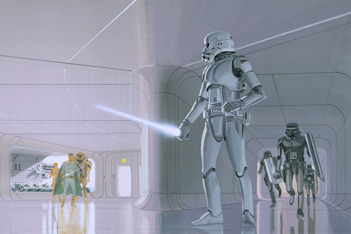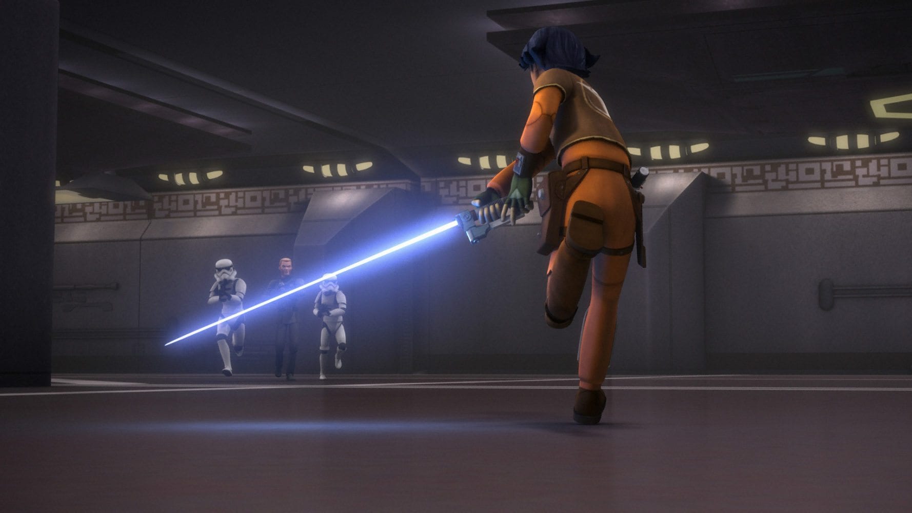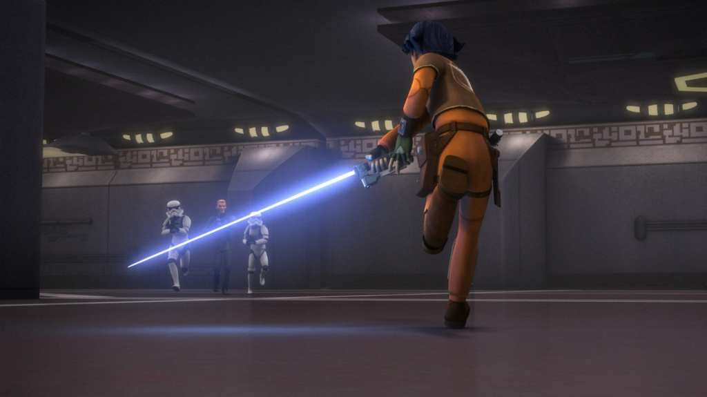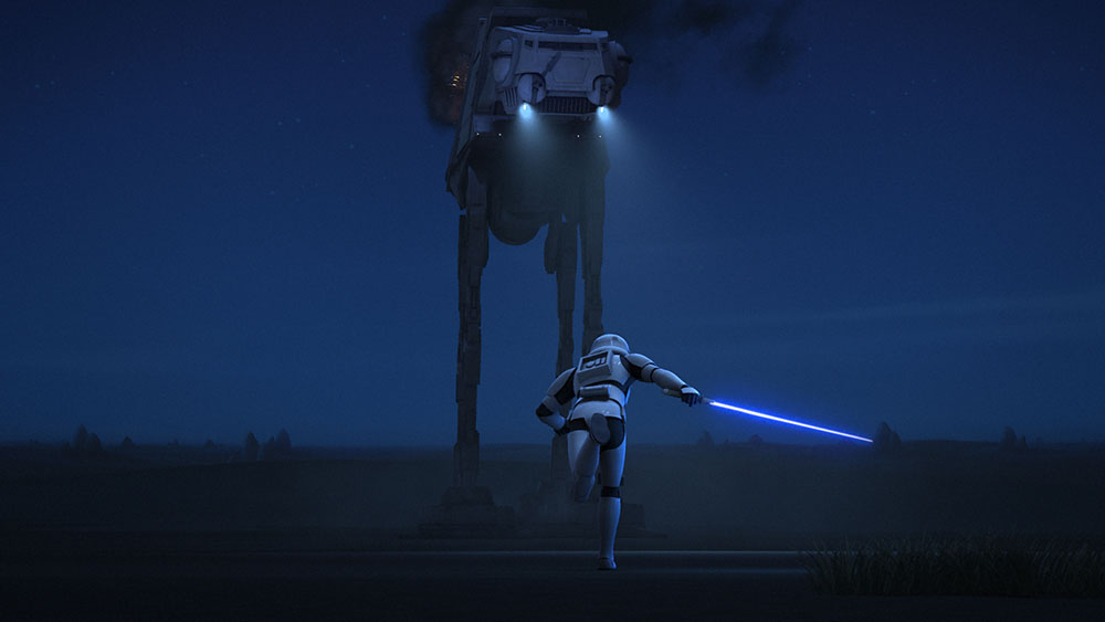 The sequence ends in a really cool visual sequence of Kanan, in full stormtrooper regalia, wielding his Lightsaber and taking out the legs of the walker before it can shoot down their appropriated cruisers. The visual of a Stormtrooper with a Lightsaber is a quirky one and a pretty cool nod to that original concept art from before the first movie where we did see white armoured soldiers wielding swords of light.