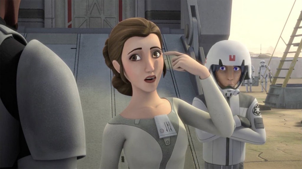 Meanwhile, we learn from Hera that the Rebel did take a hit from the Imperial ambush in the previous episode, not that we actually saw any of that. To compensate, Bail Organa is sending them three more cruisers for the Rebels to make use of in their fleet, the courier being his 15 year old daughter; Leia Organa.
