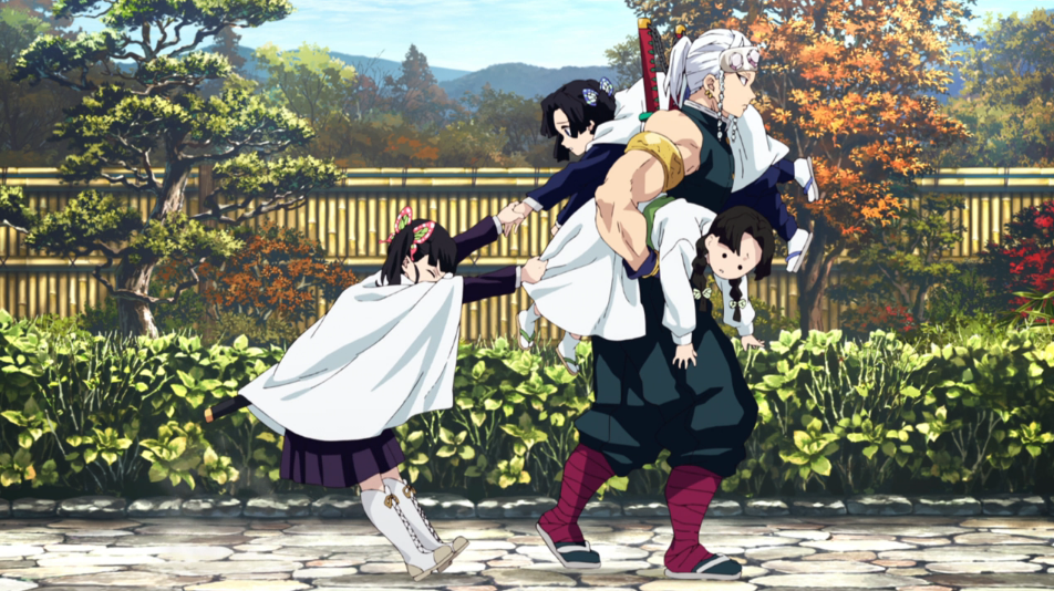 Uzui has shown up to kidnap Aoi for a mission in the Entertainment District. A choice he seems to quickly rescind when Tanjiro and his compatriots indignantly berate him and volunteer themselves in her place.