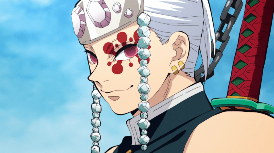 As he returns from this mission, 35 minutes into the episode, we finally see the appearance of the episode’s titular character: Sound hHshira Tengen Uzui. The self announced flashy former shinobi and his amazing skill of being immune to pissant headbutts. Oh dear, whatever will Tanjiro do now. And wait, is this Flashy Flash? Did he get way more buff and jump across from One Punch Man?