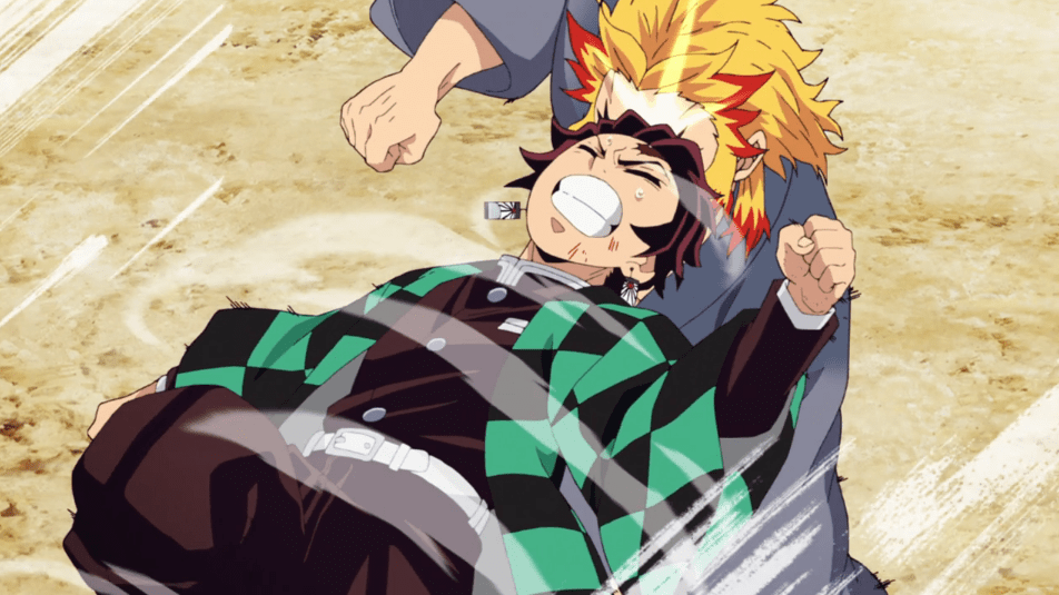 Although, the dad’s ranting and anger set off Tanjiro, who is in an understandably emotionally fragile state. And he rushes at the guy only to get his ass kicked by the former Hashira. That is until he pulls out his trusty special move: The retribution headbutt. Gotta love that rock hard head of Tanjiro getting him out of fights against much tougher opponents.