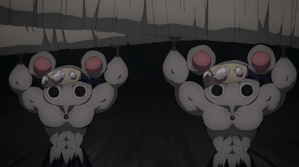 Before we see that conflict though, we need to catch up with what Inosuke and Uzui are doing. Inosuke is stressing at Tanjiro’s tardiness and ends up losing patience, launching himself into ceiling and calling for his equipment. Which is brought to him by a collection of super muscular mice… Okay, wow. I can’t say I was either ready or ever expecting this visual, but it’s the one we got and the one I have to deal with.
