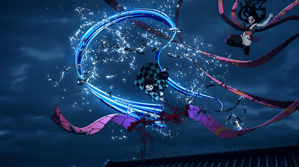 Leading us all back to the confrontation between Daki and Tanjiro. Upon recognising her as the Upper Six Demon from her eyes, Tanjiro freezes up. His las encounter with a demon of this class ended up with his self appointed mentor Rengoku dead, he shows he’s still human by freezing up as she strikes. Luckily, the blow isn’t anywhere near as fatal as any of the strikes of Azaku.