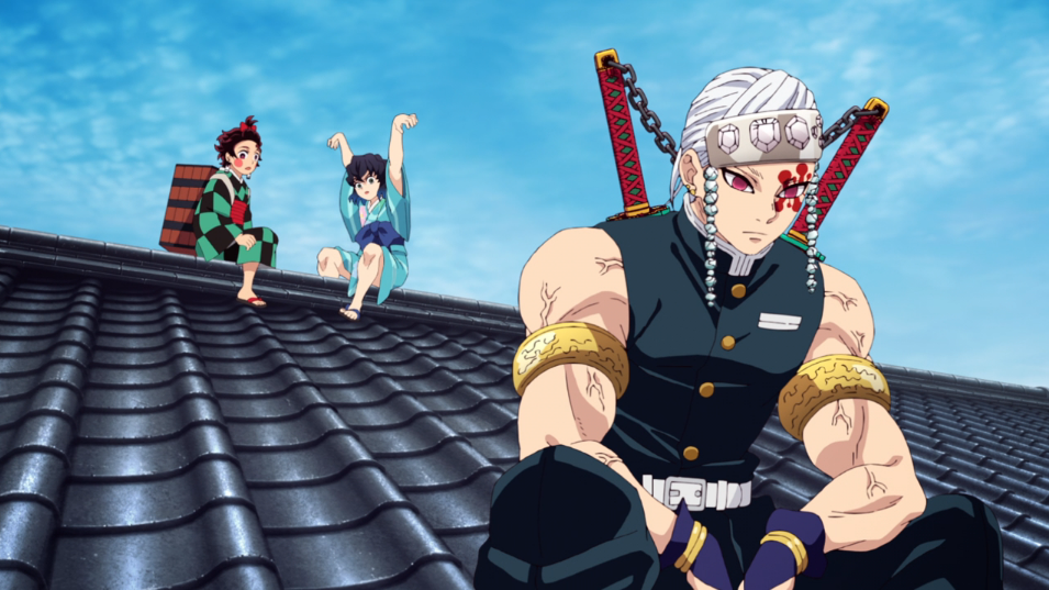 The next day, Tanjiro and Inosuke are having a meeting on a nearby rooftop to discuss their findings, while Inosuke describes, quite badly, the experience he had chasing the demon through the walls the might before. It’s at this point that ninja Uzui shows up in a flash without anybody noticing her was even there.
