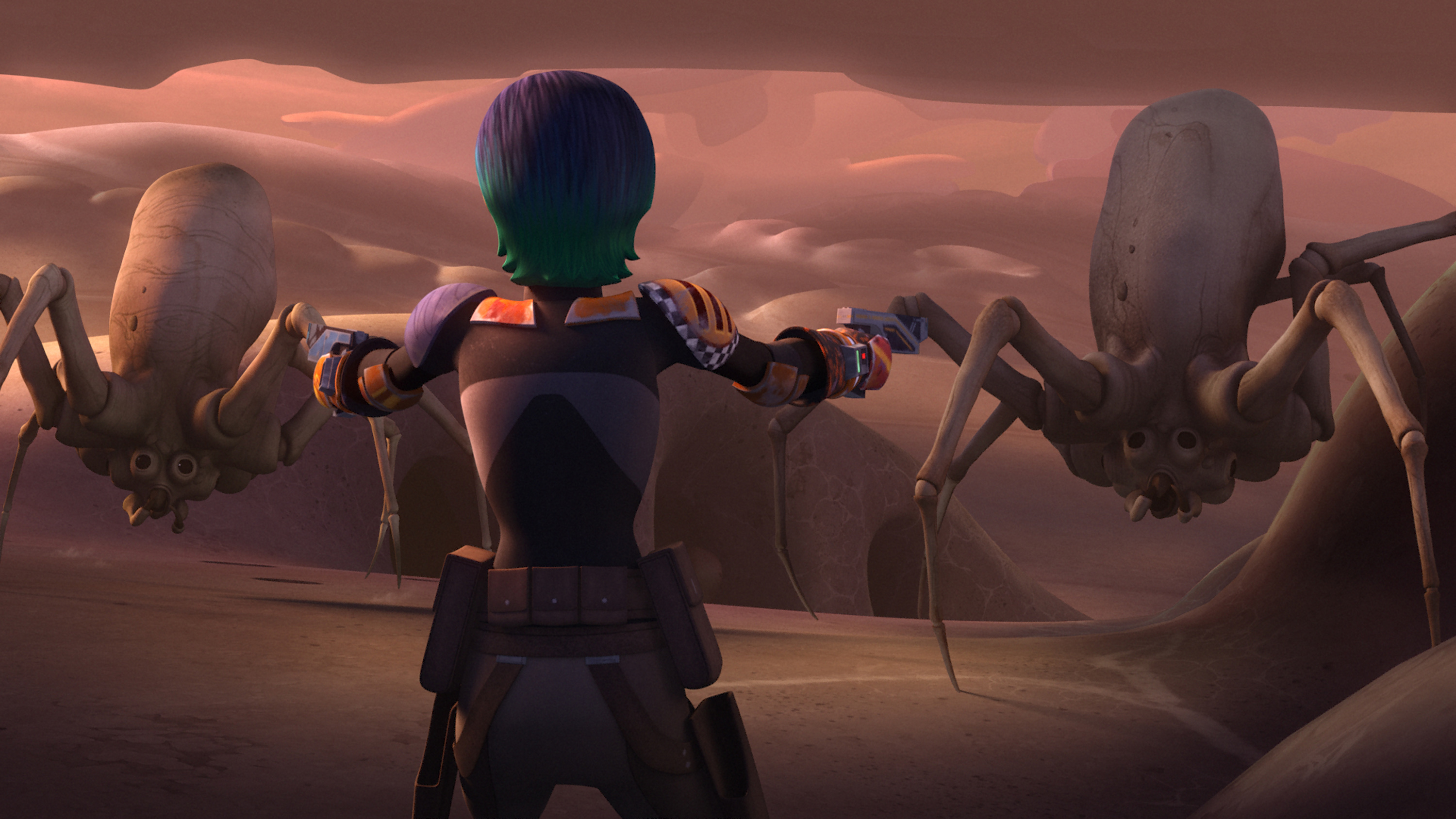 The romance between her and Kanan has been all but relegated to subtext once the series got started proper. Because God forbid you depict two characters in a relationship in a children’s show. Before they can leave though, they learn that one of their scouts has gone missing, when Sabine and Rex investigate, they discover a bunch of big spiders that swoop in and take Rex into their burrow.
