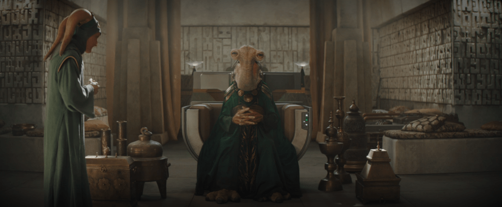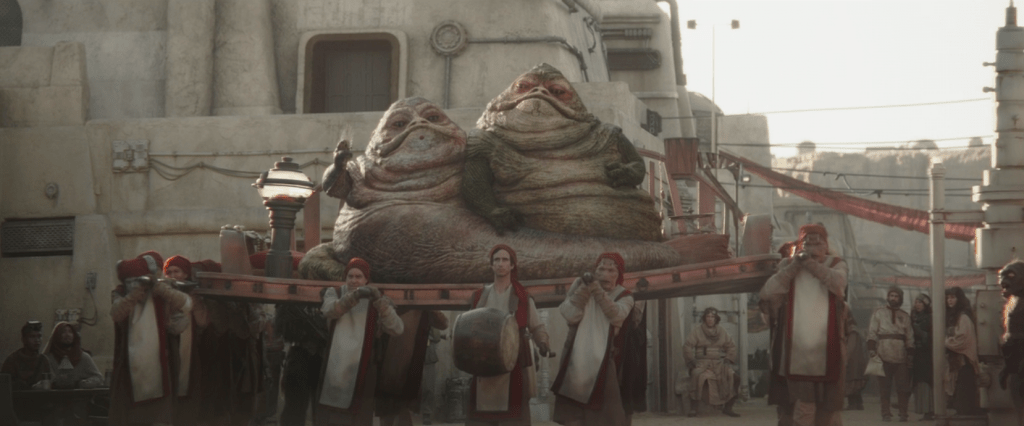 Which is when we get a very cool scene where a litter, looking like it’s close to buckling under the weight of two Hutt twins arrives at the Sanctuary, seemingly to intimidate Boba Fett away from his claim over the planet of Tatooine. You know what, Fennic was right about the litter. While the Hutt’s themselves don’t seem like they’ve be anything Boba couldn’t handle, their mere excessive presence makes them feel much grander than they might, in fact, be.