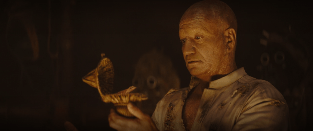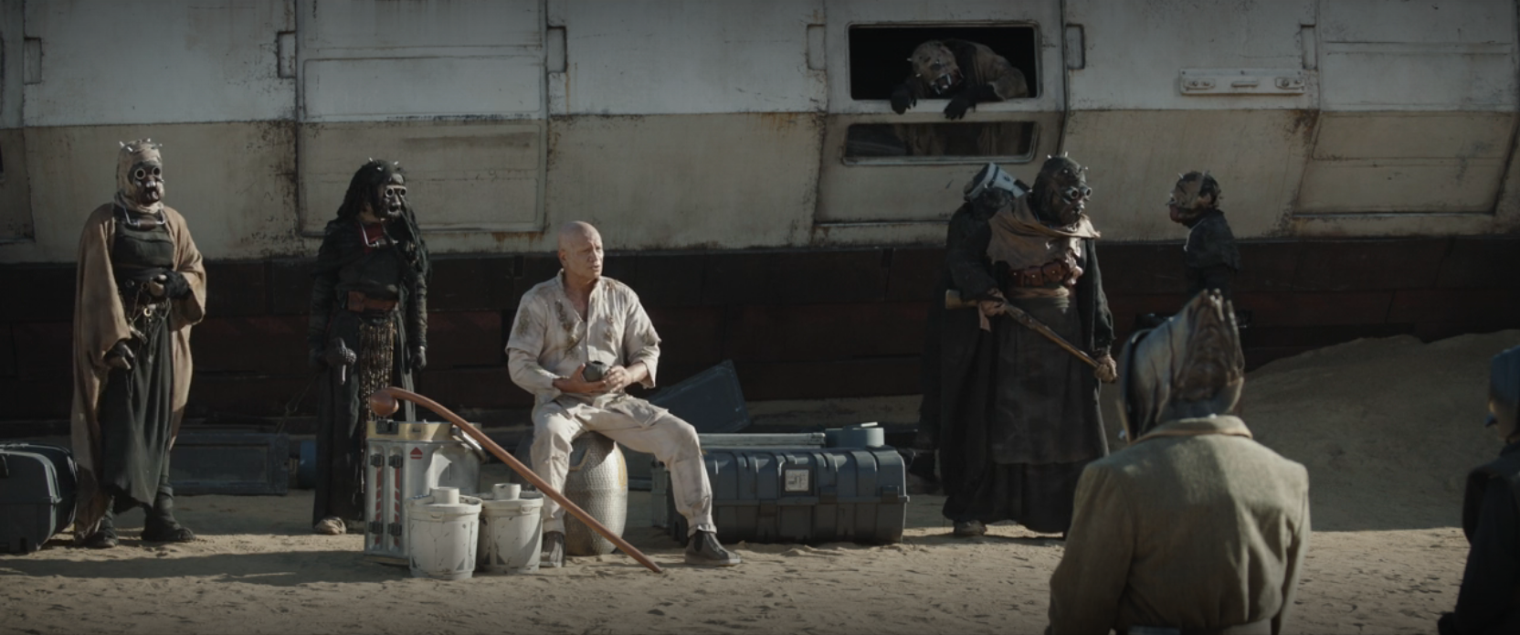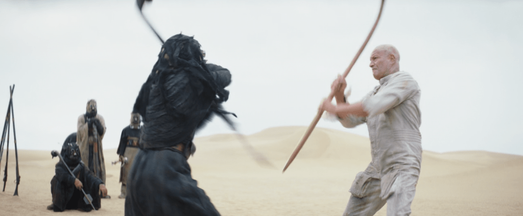 Which is a distinction I’ve felt like modern Star Wars love to lean into. The whole mashup of Samurai and Gunslingers, the East vs. West thing. I think it works really well to be honest, and this is a cool sequence. One that really makes up for the lack of any real action in the first episode. As it turns out, the train is run by the Pykes, imagine that, and they’re running spice through the Dune Sea.