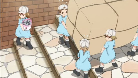 “Scrape Wound” begins with our main Red Blood Cell girl once again utterly lost and unable to perform her vital function as a personification of blood. During this minor issue, we are treated to an extended sequence of the adorable little children that represent the platelets hauling some heavy equipment down a small stairway.